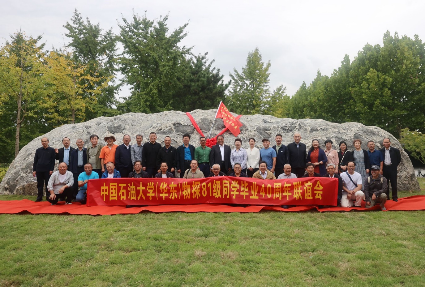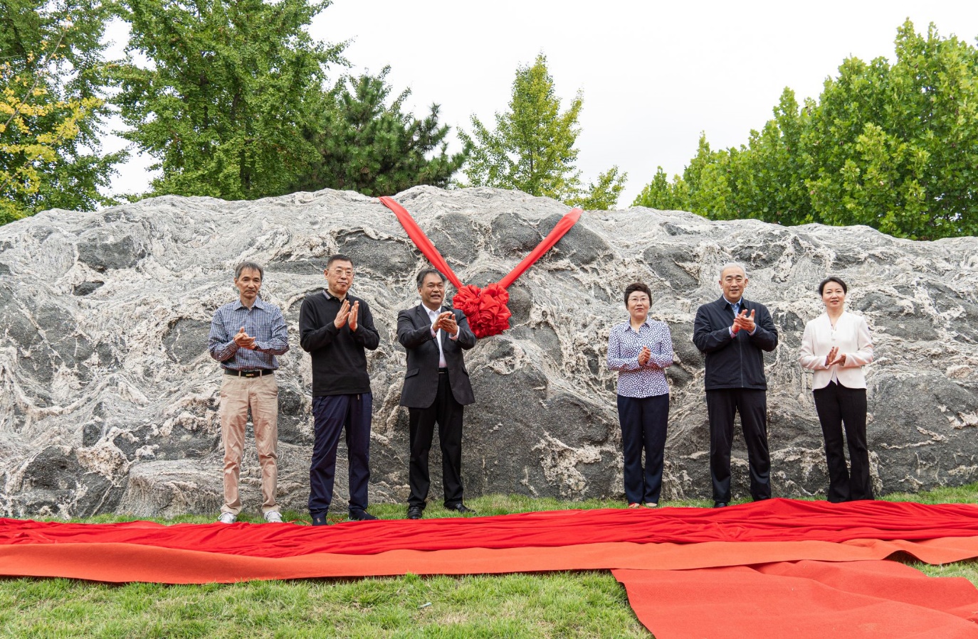 张玲玲、赵放辉、王效美、周锦明,以及物探81级1班班长李涛、物探81级2班班长杨国权共同为景观石揭幕,现场响起热烈掌声。