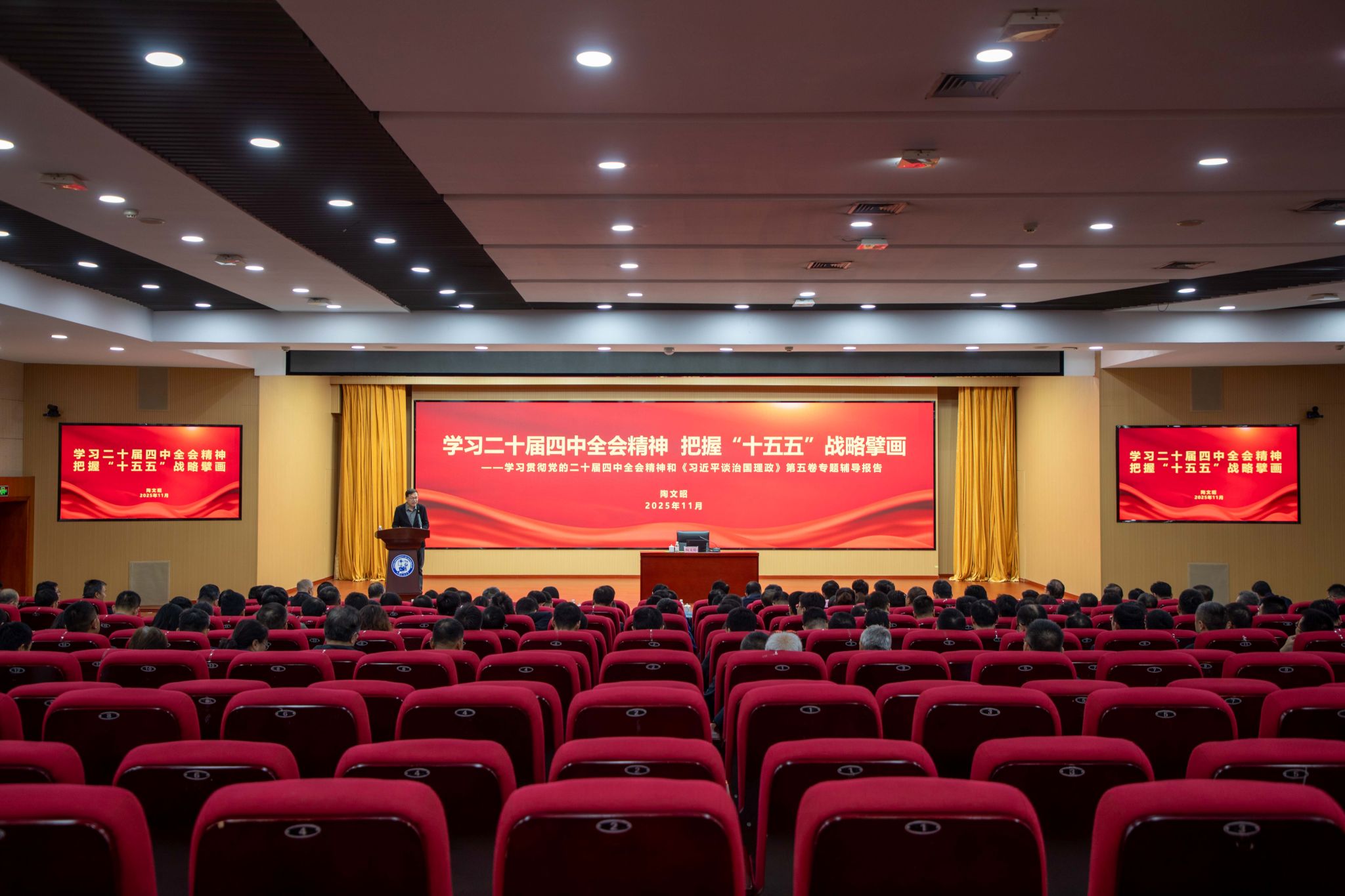 11月5日,学校举行党的二十届四中全会精神专题辅导报告会,邀请中国人民大学陶文昭教授作《学习二十届四中全会精神 把握“十五五”战略擘画》专题辅导报告。党委书记吴强明,副校长张玲玲,党委副书记万云波,党委副书记、纪委书记刘珂,党委常委赵放辉、蒋文春,校长助理于连栋出席会议。万云波主持会议,校院两级伟德bevictor中文版组成员、全校中层干部、各民主党派负责人、马克思主义学院教师、辅导员参加会议。