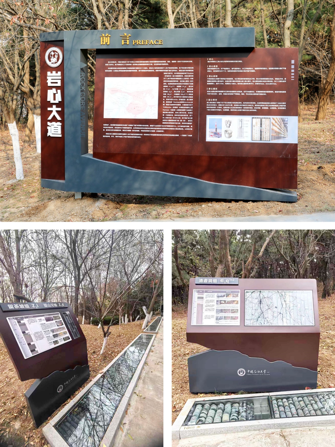 岩心大道作为二期建设的核心景观与科教走廊,依托小黄山原有道路改造提升,集中展示了朱光有校友捐赠的下古生界寒武系至上元古界南华系连续1400米长的钻井岩心样本。通过在主干道一侧建成岩心实物展示区,真实还原岩心各个深度的真实样貌,全面展示我国南方上扬子地区上元古界——下古生界地层的演变;通过建设文化展示墙,对典型层段岩心特征进行详解介绍,使师生在漫步中直观感受地下岩层的实际特点及其演变历史。大道不仅成为校园一道独特的风景线,更化身“行走的地质课堂”,助力学校地学人才培养与学科文化传播。